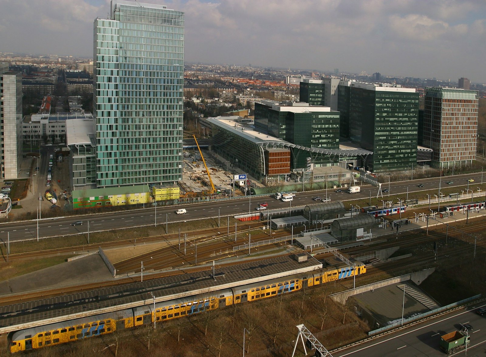 We kijken vanuit een van de zes hoge kantoortorens van het project Maher 4 neer op de Zuidas. We zien de de A10 Zuid en het treinstation dat toen nog bekend stond als Amsterdam Zuid WTC. Rechts is ook nog een metro zichtbaar in de oude kleurstelling van het GVB: wit, rood en blauw. Het is maart 2004 en de Zuidas is volop in ontwikkeling. Op de foto zijn bouwwerkzaamheden aan het station zichtbaar. Er wordt een ondergrondse garage voor fietsen gebouwd en er komt een passage met winkeltjes.